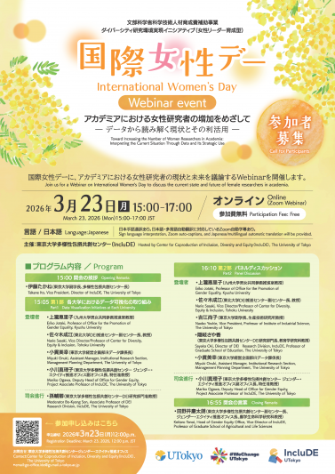 3月23日(月)に国際女性デーWebinarイベント 「アカデミアにおける女性研究者の増加をめざして ― データから読み解く現状とその利活用」(主催:東京大学多様性包摂共創センター)が開催されます。