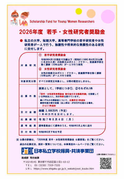 【URL】 若手・女性研究者奨励金|私学振興事業(助成業務)|私学事業団 (shigaku.go.jp)